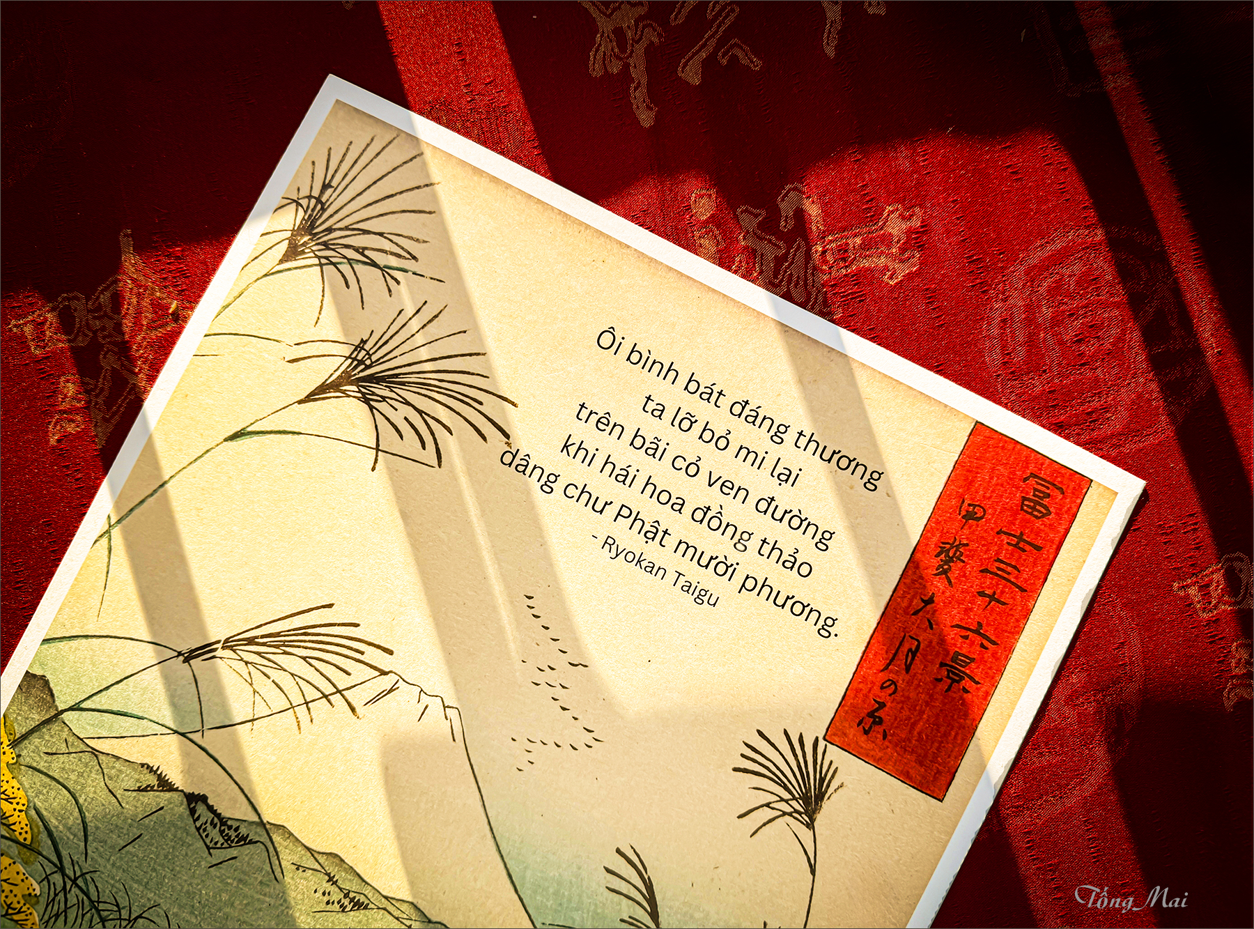 Đêm nay, tôi gởi vào đây một Wabi-sabi: Cánh đồng poppy ở California tôi chụp tháng trước sau khi mùa hoa nở rộ đã qua đi, chỉ còn lại rải rác những mảng màu thưa trên cỏ xanh. Trong những Haiku của em, em gọi hoa dại là hoa đồng thảo, tôi thì gọi là wabi-sabi của thiên nhiên – một wabi nhỏ bé khiêm nhường lặng lẽ, sống hồn nhiên như chim trời, không vất vả nhọc nhằn; và một sabi qua thời gian quạnh hiu, héo úa, u sầu và phù du.